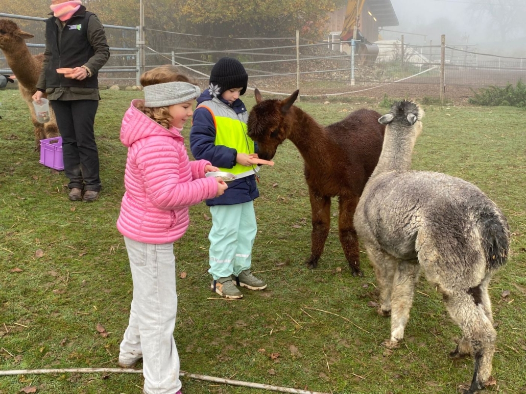 Am dritten Posten fütterten wir die Alpakas. Viele Kinder waren sehr mutig und gaben den Tieren ruhig und geduldig ihr Futter. Die sanften Alpakas kamen neugierig näher und liessen sich gerne füttern.