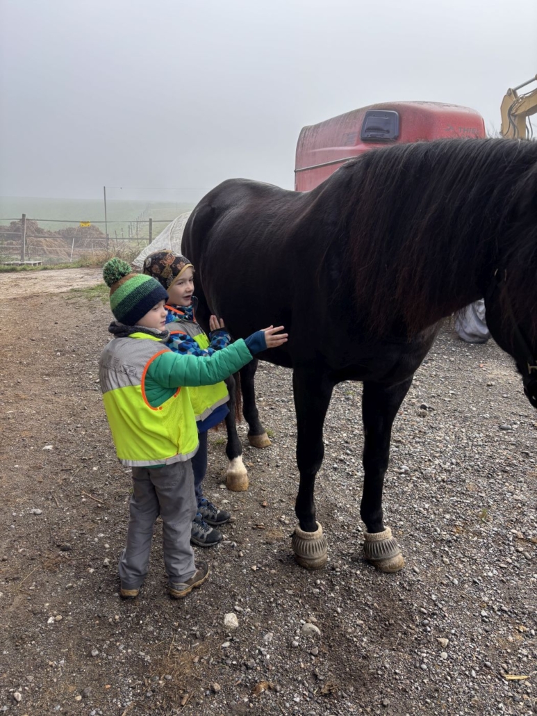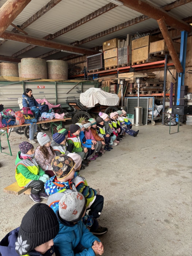 Wir waren auf dem Heinigers Grundhof in Dietlikon und verbrachten dort einen spannenden und lehrreichen Morgen. Die Reise führte uns zuerst mit dem Zug nach Dietlikon und danach mit dem Bus bis in die Nähe des Bauernhofs. Als wir dort ankamen, wurden wir herzlich vom Bauern, der Bäuerin und einer weiteren Hofmitarbeiterin empfangen. Gleich zu Beginn durften wir ein Pferd aus dem Stall streicheln, was für viele Kinder ein besonderer Moment war. Anschliessend teilten wir uns in drei Gruppen auf und besuchten nacheinander die vorbereiteten Posten.