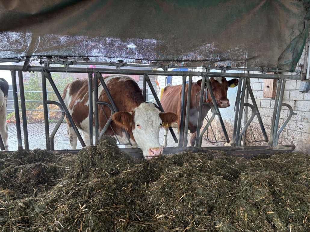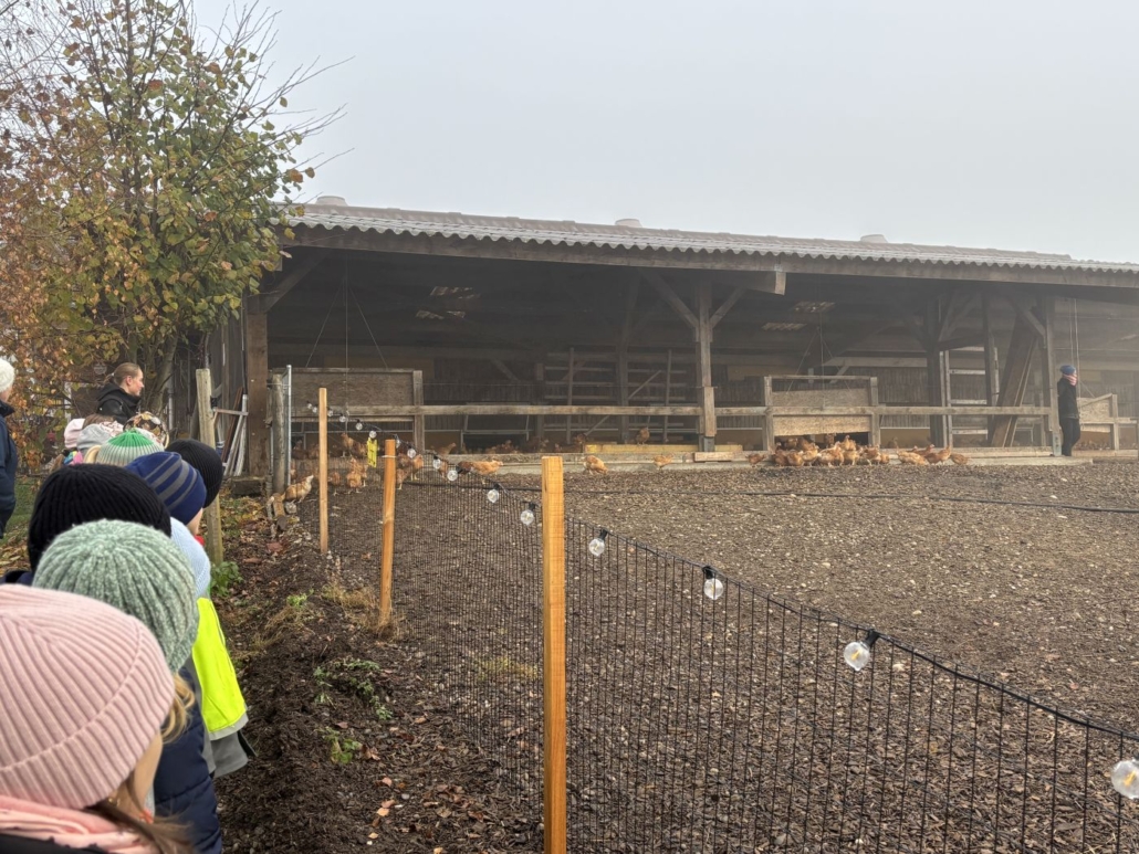 Beim zweiten Posten besuchten wir die Kühe und Hühner des Hofes. Die Bäuerin zeigte uns das Futter der Tiere und erklärte uns vieles über ihre Haltung. Wir durften Kühe streicheln und frische Kuhmilch probieren. Besonders beeindruckend war die grosse Anzahl von 4000 Hühnern, die auf dem Hof leben.